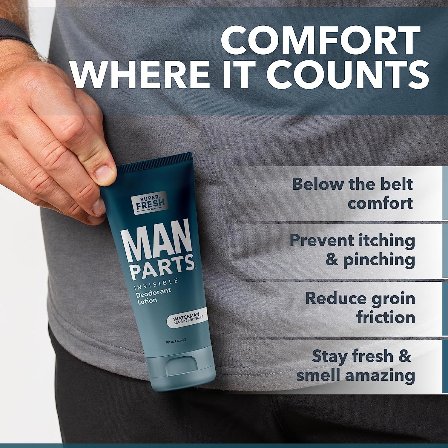 • MOISTURIZE, HYDRATE, AND PROTECT: Say good bye to awkward kick-outs and pant-pocket adjustments to unstick the bits. Super Fresh Man Parts will keep your skin hydrated, comfortable, and smelling fantastic.